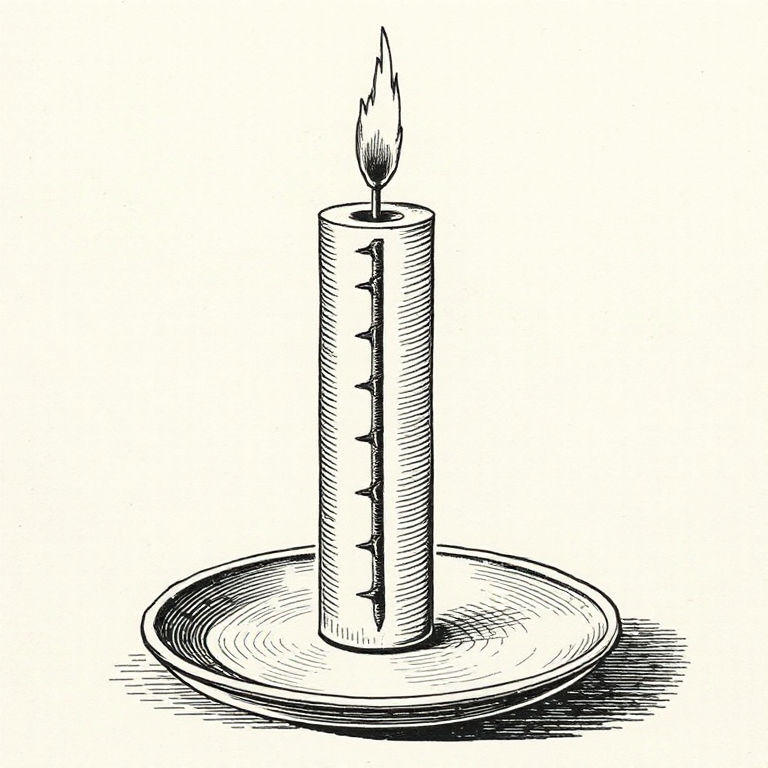 Candles as clocks were simpler but clever. You’d mark a candle at regular intervals and burn it down, reading the time from how much remained. King Alfred the Great is traditionally credited with using graduated candles to regulate his daily routine in the 9th century, though the story is likely embroidered. The truly ingenious trick was the candle alarm clock: push tacks or small nails into the wax at a specific height. When the candle burns down to that point, the tacks fall onto a metal plate below with a clatter. You’ve just been woken up by a piece of wax and some hardware.